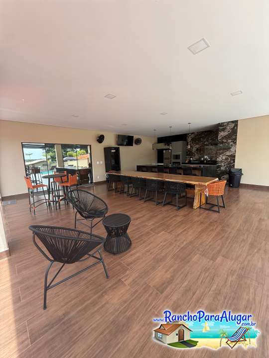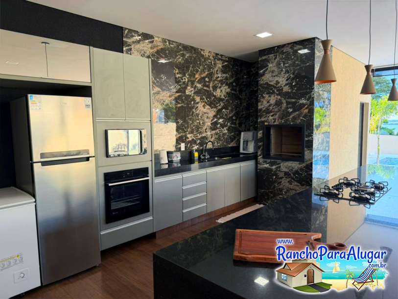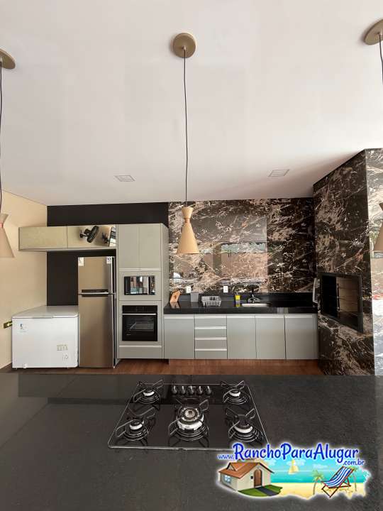 Churrasqueira em alvenaria, Freezer, cervejeira, geladeira, fogão 5 bocas, microondas, forno elétrico.